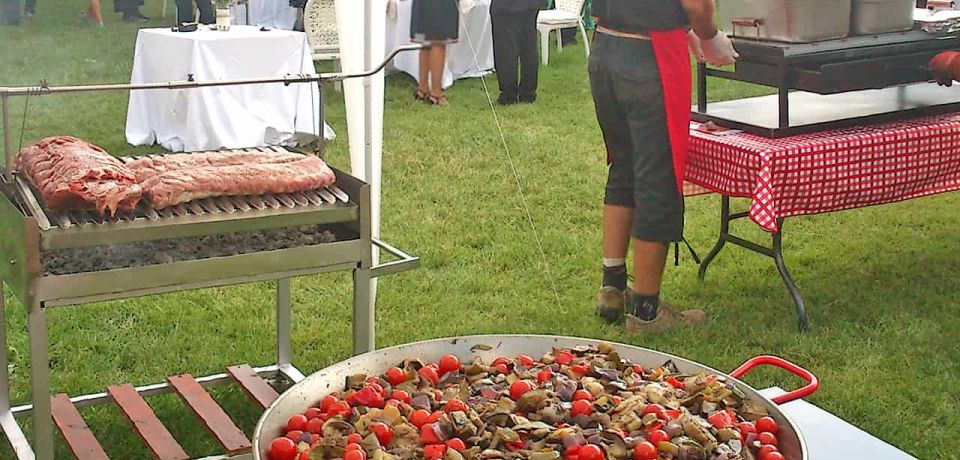 Disponemos de todos los utensilios necesarios para realizar nuestra labor (leña, mesas de trabajo y para buffet, planchas de mantenimiento de comida, parrillas, horno eléctrico para hornear/ asar al momento acompañamientos como el pan, verduras, empanadas criollas).